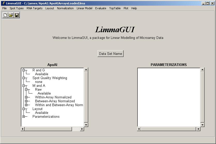 It is possible to save multiple Limma files with the same data set name (displayed above the left status window) but with different file names (displayed in the title bar).