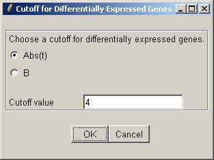 We can now choose a cutoff for differentially expressed genes, which will be highlighted in the plot. Choose a cutoff of abs(t)>4.