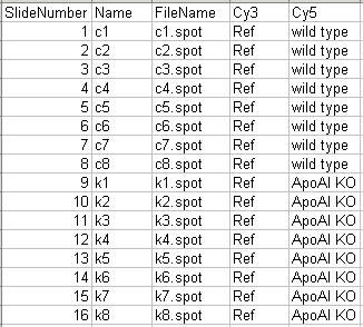 Hybridizations. The experiment compared 8 ApoAI knockout mice with 8 normal C57BL/6 ("black six") mice, the control mice. For each of these 16 mice, target mRNA was obtained from liver tissue and labelled using a Cy5 dye. The RNA from each mouse was hybridized to a separate microarray. Common reference RNA was labelled with Cy3 dye and used for all the arrays. The reference RNA was obtained by pooling RNA extracted from the 8 control mice.
