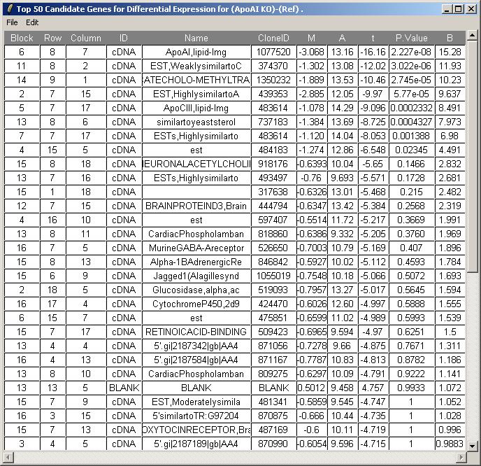 We will now request at a table of genes ranked in order of evidence for differential expression (more precisely, ranked by the B statistic, which estimates the log odds of differential expression for each gene). From the TopTable menu, select "Table of Genes Ranked in order of Differential Expression".