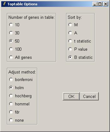 Choose to view the top 50 genes with most evidence of differential expression (according to the B statistic). Leave the other options at their default values.