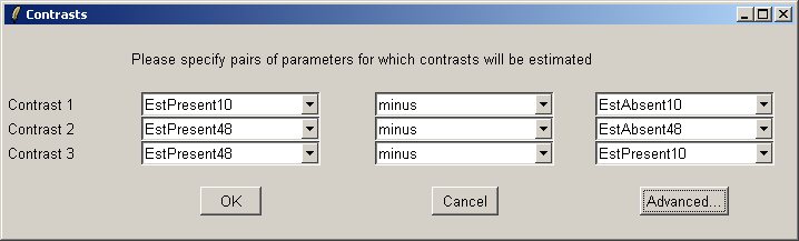 The "Advanced" button can be used to enter the contrasts as a matrix or to see the corresponding contrasts matrix obtained from the paris of arrays selected. The number of pairs of drop down combo boxes is chosen to be one less than the number of unique targets in the Target column of the Targets file as long as this does not exceed ten pairs in total. For now, this total number of contrasts must be the same for all contrasts parameterizations, but you can just leave some of the blank if desired. For example, you may choose to use only one comparison, EstPresent10 vs EstAbsent10.