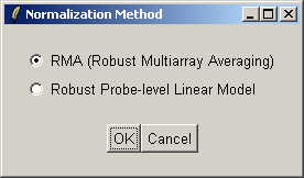 There are currently two normalization methods in affylmGUI, Robust Multiarray Averaging (RMA) and