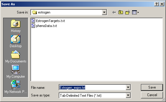 If you haven't already done so, you should save your work, by selecting "Save" from the File menu. This will save a binary RData file with the extension ".lma" (Linear models for MicroArrays).