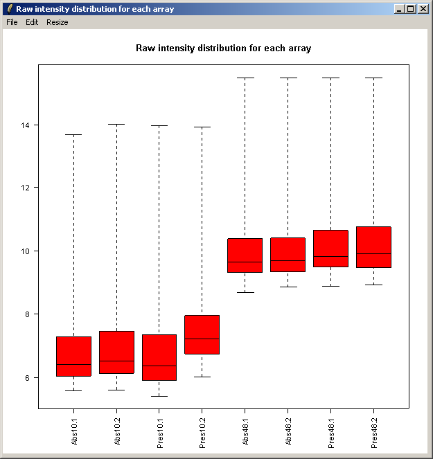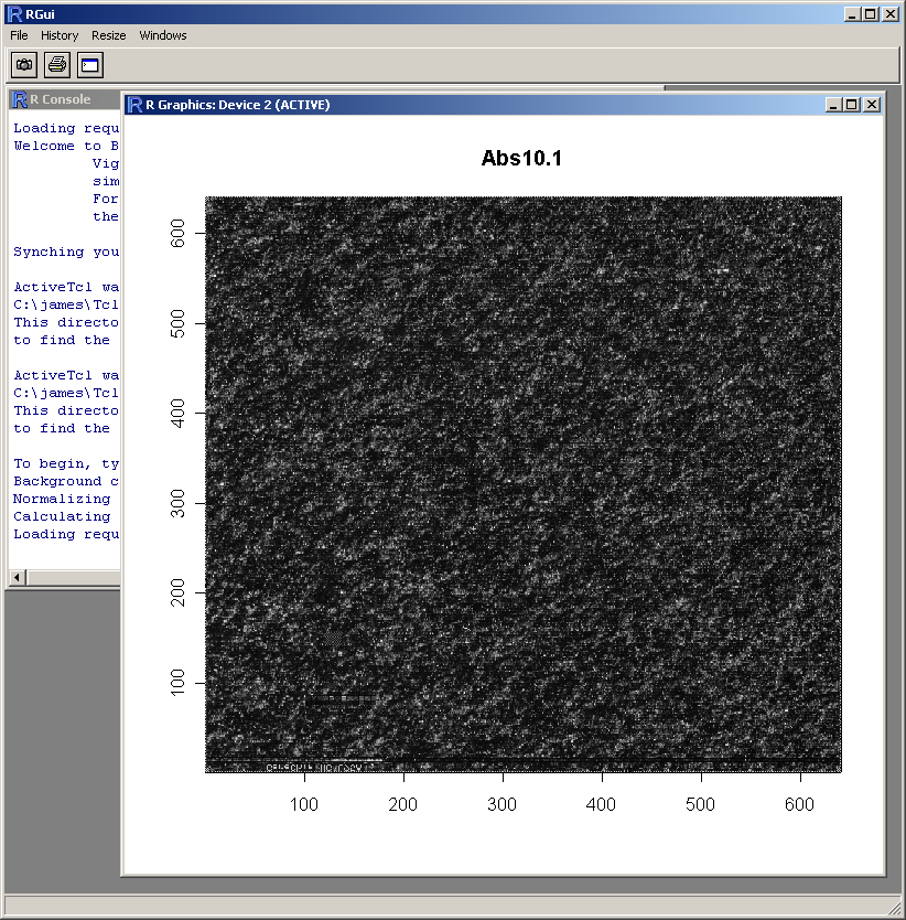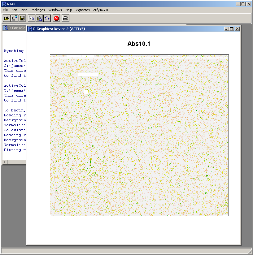 Because this probe-level plot can potentially use a lot of memory, there is an option available to plot it in the usual R graphics device (shown above for Windows). Along with the image plots shown earlier, this plot can be used to identify spatial artefacts such as scratches or smudges or boundary effects.