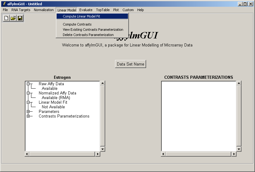 Now select "Linear Model Fit" from the Linear Model menu. The linear model is used to average data between replicate arrays and also look for variability between them.