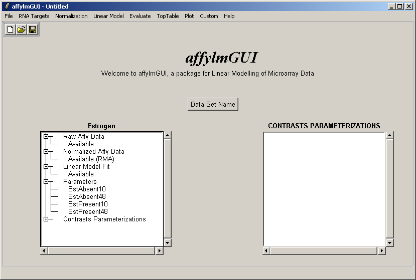 The main window of affylmGUI is shown above. From the File menu, click on "New" to begin a new analysis.