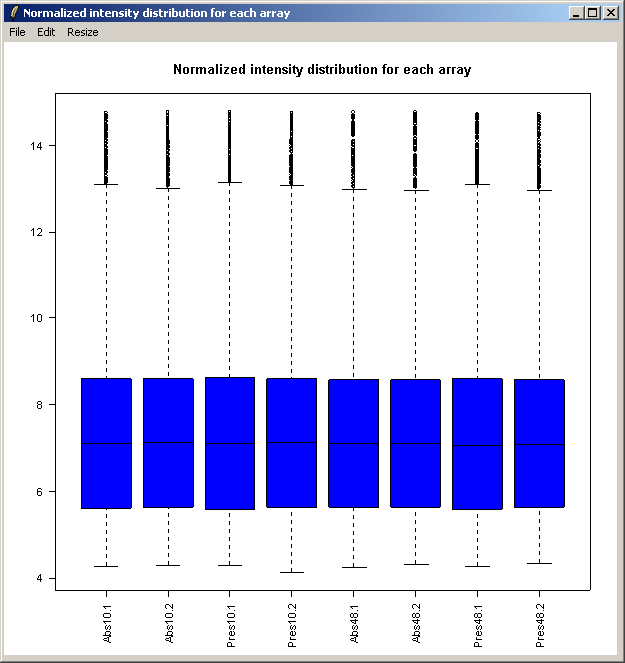 The resulting plot is shown above. Next we will show the same intensity box plot using normalized data. The normalization will remove effects seen in large proportions of the data (in this case a time effect is obvious) while still preserving effects seen in small proportions of the data. We hope that we will find a small number of genes with significantly different expression levels between the non-replicate arrays and that these genes do not make up a large enough proportion to seriously question the assumptions of normalization. Generally normalization of microarray data does more good than harm, because it removes artificial biases due to the technology rather than the biology.