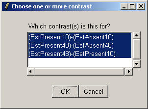 Here we will compare Estrogen Present with Estrogen Absent at the two different times and also make a time comparison for Estrogen Present. Note that if you want to simply compare Estrogen Present with Estrogen Absent, you will need to modify the Target column of the Targets file and begin a new analysis.